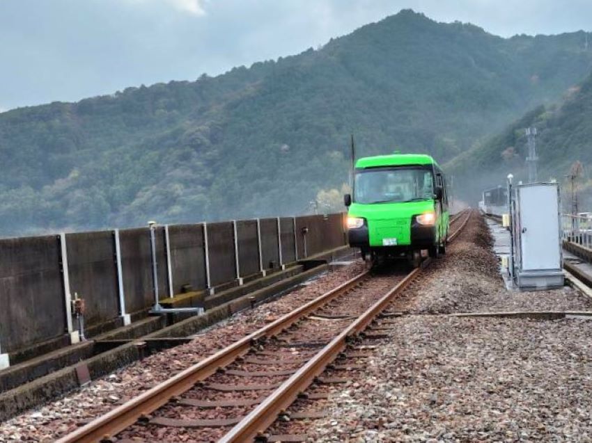 | 16.17.世界初のDMV(Dual Mode Vehicle)に乗車、気分は快適。ナンバープレートが付いている | |
