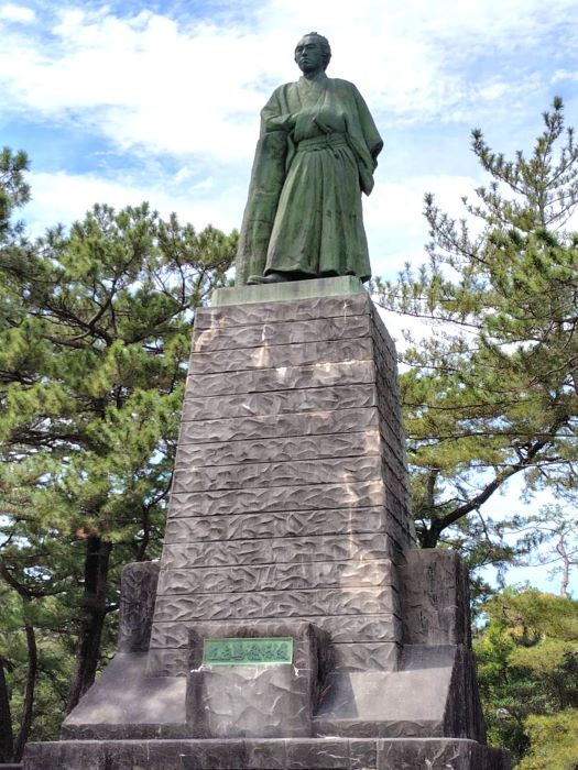 | 33.桂浜の坂本龍馬像を見て幕末に思いを馳せた | 34.高知駅前にある土佐藩の三名の偉人 左から武市半平太、坂本竜馬、中岡慎太郎 |
