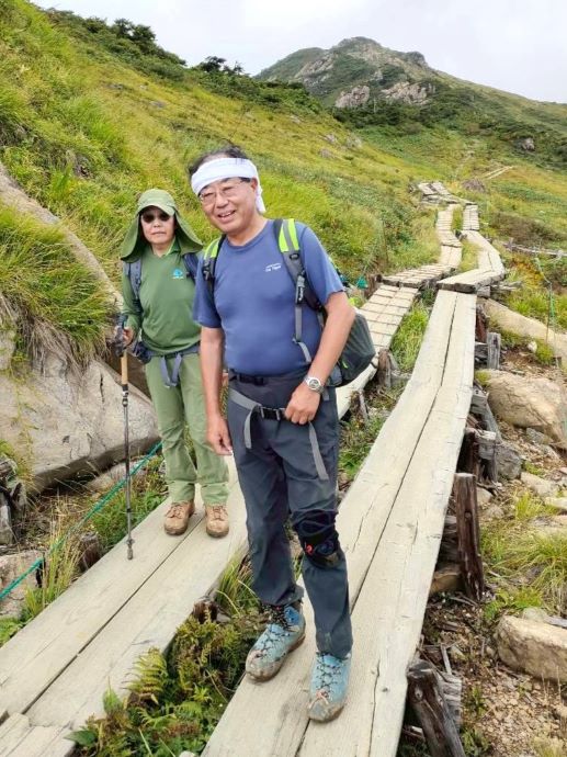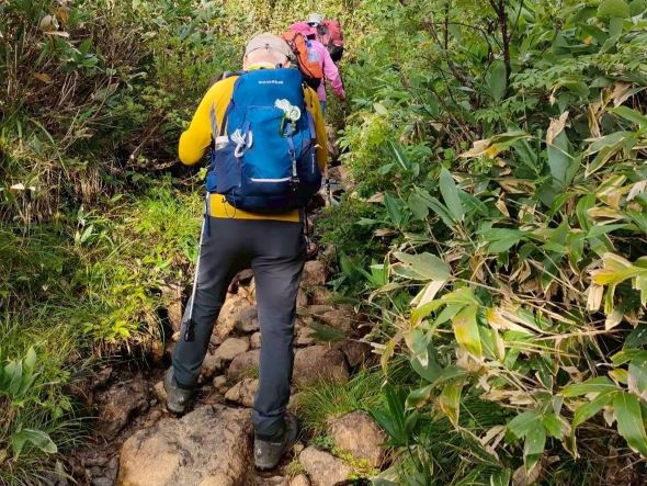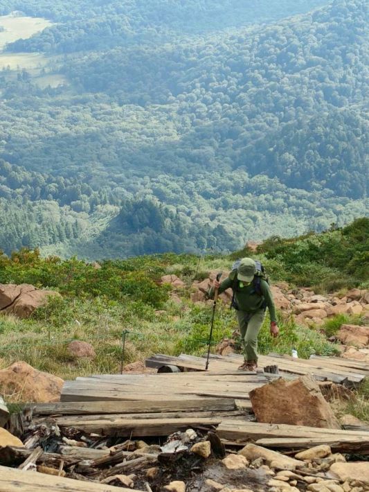 19.だいぶ朽ちている木道、行く手には朝霧 | 20.岩がゴロゴロの急登が始まる |