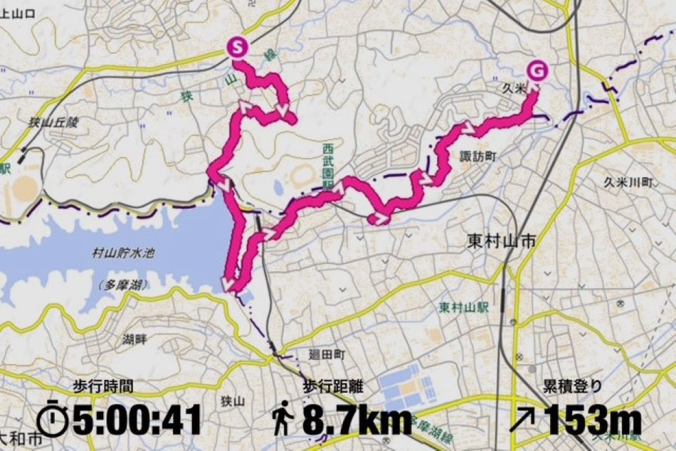 | 西武狭山線下山口駅~荒幡富士~都立狭山公園~八国山(久米)までのルート | |