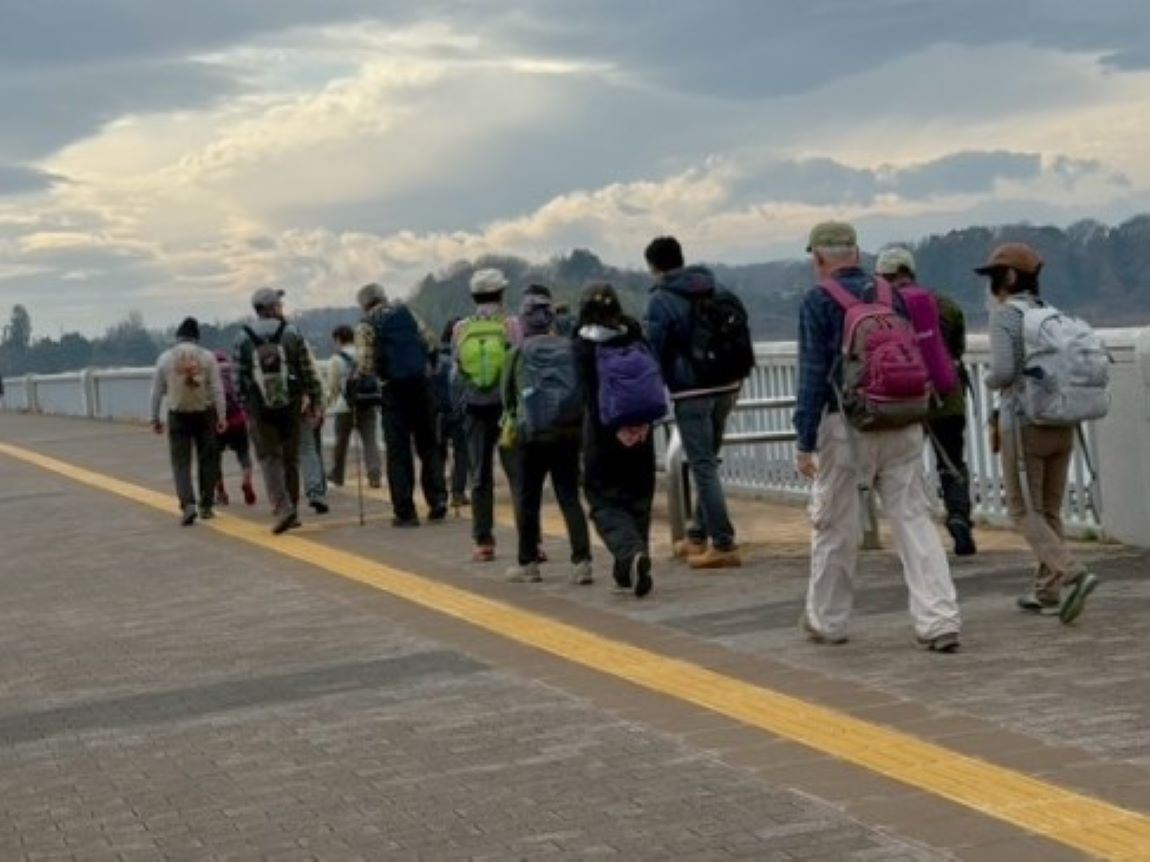 | 11.多摩湖でも富士山は拝めなかったが 談笑しながら一直線の堰堤を渡る |