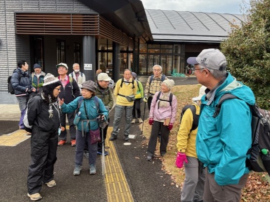 | 01.曇り時々雨の予報を「CLの念力で」 ハイキング日和? 下山口駅でCLの訓示 |