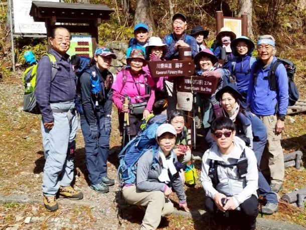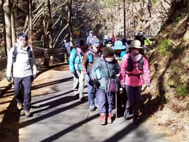 | 01.川乗り橋ゲート入口で | 02.登山口への舗装道をみんな和気あいあい |