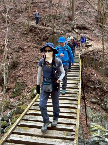| 07.怖くてポーズも緊張気味。重量制限に注意!! | 08.川乗谷にかかる橋をいくつも渡ります |