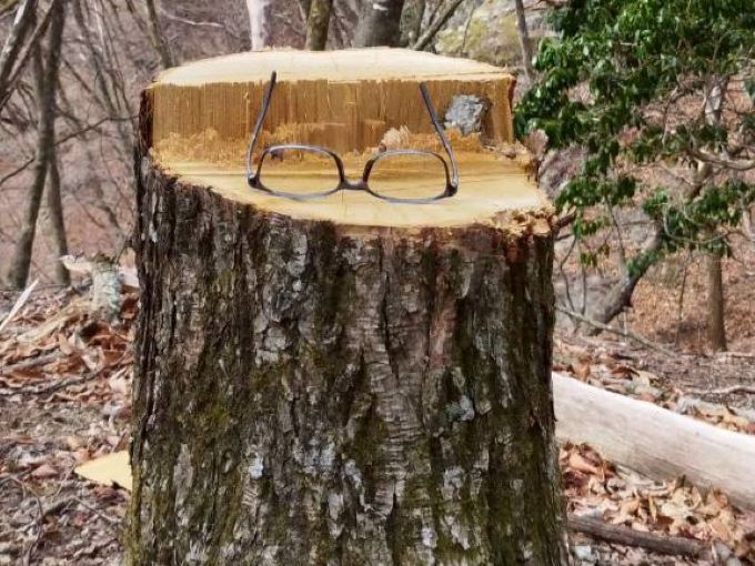 | 22.下りもリーダーのルート確認 | 23.切り株にメガネの忘れ物⁉それともオブジェ? |