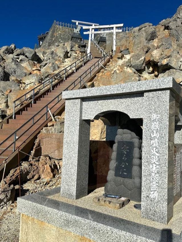 14.このようなガレ場続く | 15.2014年の噴火の犠牲者の慰霊碑 この階段の上が御嶽山山頂 |