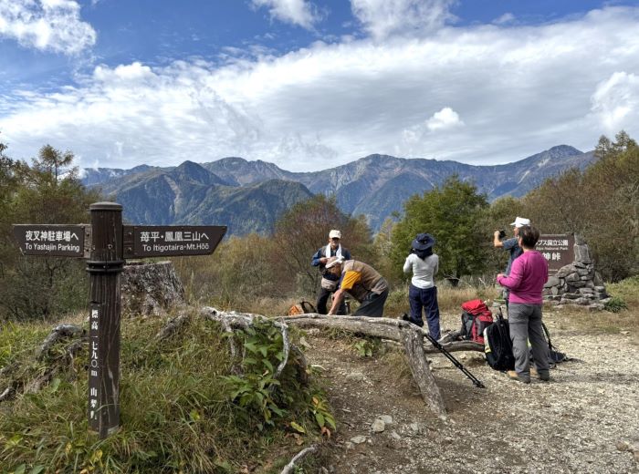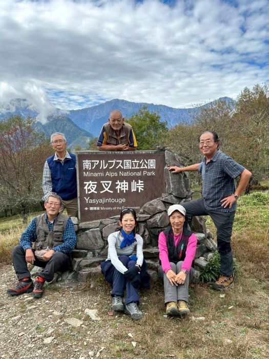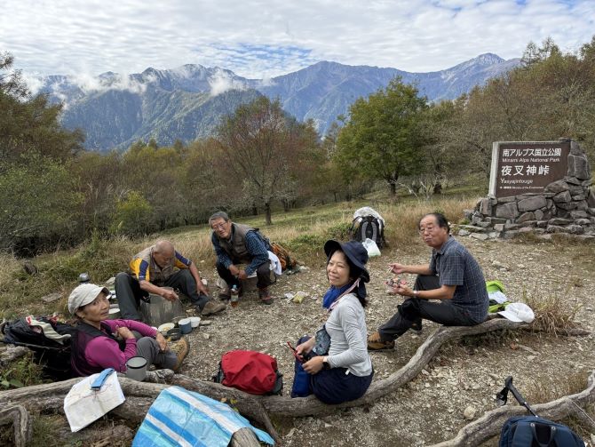 | 15.夜叉神峠到着。素晴らしい景色! 白根三山が一望です!!! | 16.ここで高谷山グループと白根三山を眺めながら 味噌汁を作るグループと分かれる |
