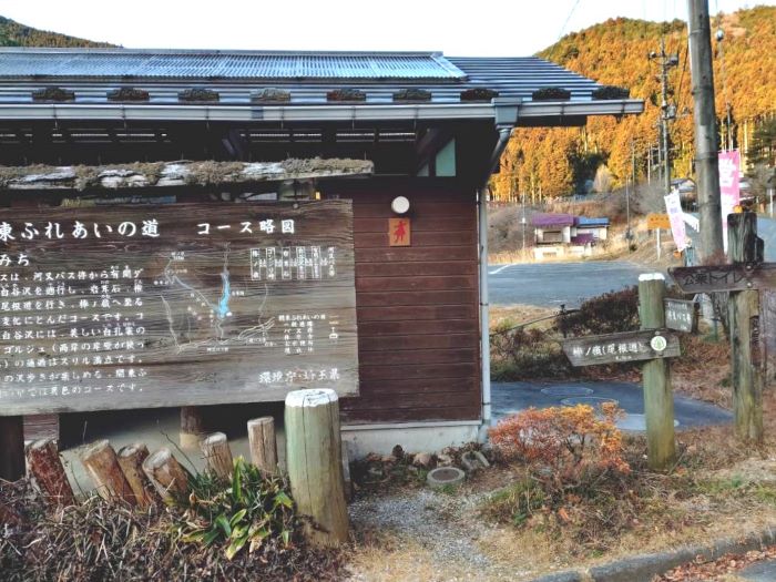 | 01.河又名栗湖入口バス停先のトイレ完備の休憩所 | 02.滝の平尾根への入口 |