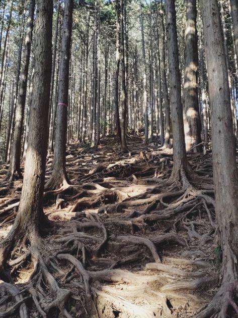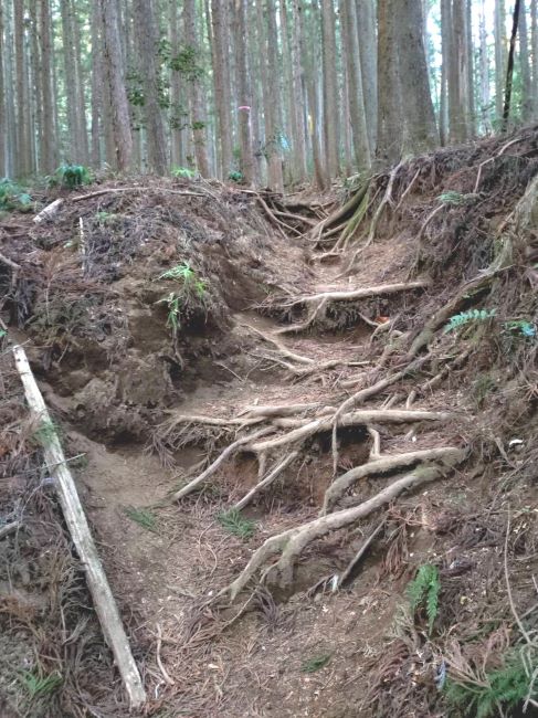 | 03.木の根の張り出したタフな道を行く | 04.林道を3つ横切る |