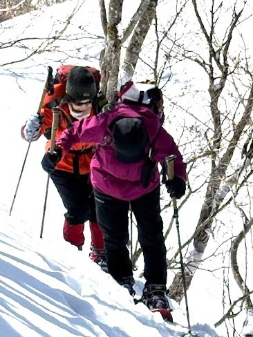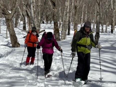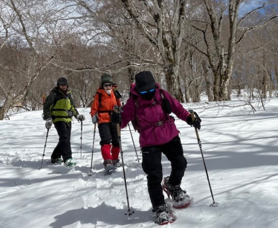| 13.武尊山ルートの夏道ルートで森林地帯を下る | 14.締まった雪に新雪が降り積もり スノーシュー最高! |