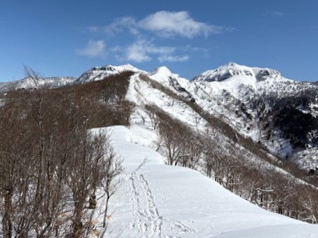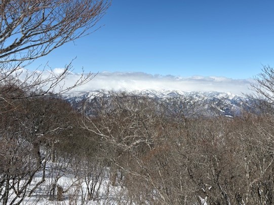 | 07.鹿俣山から続く尾根の先には 獅子ケ鼻山、剣ケ峰山の連なりが真っ白 |