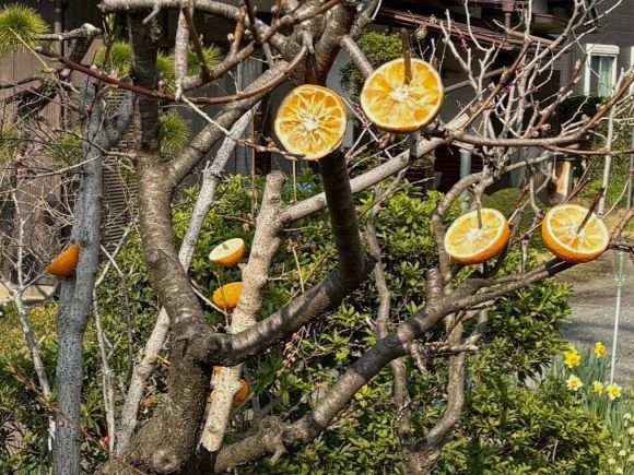 | 15.堀之内バス停近くの民家の庭先 ミカンの輪切りは野鳥のご馳走用か? |