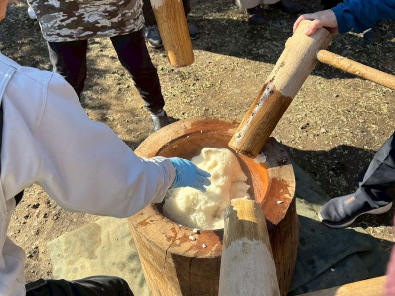 | 03.いよいよ餅つき開始 | 04.まずは蒸したもち米を、こねて潰します |