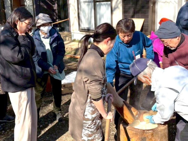 | 05.もち米のつぶれ具合を確認 | 06.三人で、いち、にぃ、さん (トン、テン、カン)とリズミカルに |