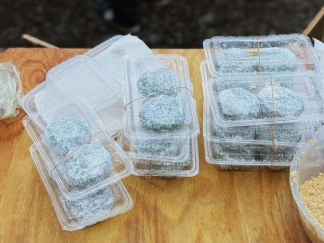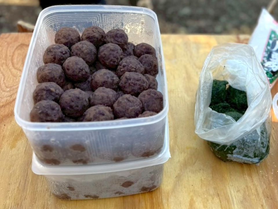 | 13.ここからはヨモギ入りの大福づくり。ヨモギは昨年摘んだものを冷凍保存 あんこも手づくり、あんこ玉の数100個以上、その分手間がかかります |