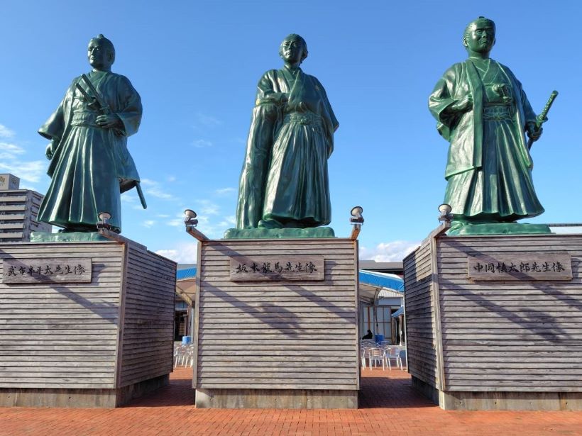 | 33.桂浜の坂本龍馬像を見て幕末に思いを馳せた | 34.高知駅前にある土佐藩の三名の偉人 左から武市半平太、坂本竜馬、中岡慎太郎 |