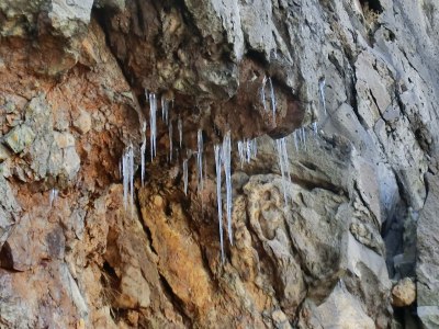 | 11.焼岳を焼岳山荘方面に下ると北稜側の寒さが分かった、長い氷柱が!? | 12.焼岳山頂で腹ごしらえをして、焼岳山荘に向かって焼岳を下る |