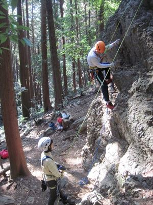 | 03.ここが練習場所の子供岩です。ロープの輪に足を入れて登っていきますが今日は練習なので、形だけを学びます。 | 04.さすがMさんは上手です。 |