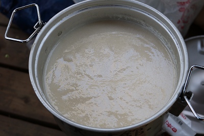 | 09.定番男性シェフ2人が今回不在だったが心配不要。25人分の味噌汁、甘酒が手際よくできあがる。 | 10・11.作品はしあがりはこの通り。5つの鍋、すべて完食、好評であった |