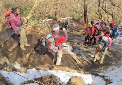 | 22.23. 階段を過ぎ岩場の道には「凍結注意」の立て看板あり | |