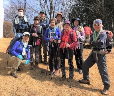 06.丸山山頂での集合写真。晴天で皆さん笑顔 展望台からは春霞で今一つ |