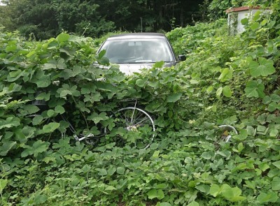 16.葛(クズ)の葉と蔓(ツル)に覆われた 自家用車と自転車。いづれもクズ(廃車)? |