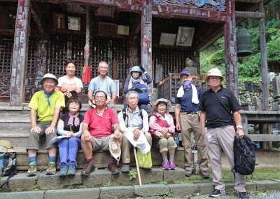 | 29.本堂前で「般若心経」を唱えるメンバー 何事も経験です |
