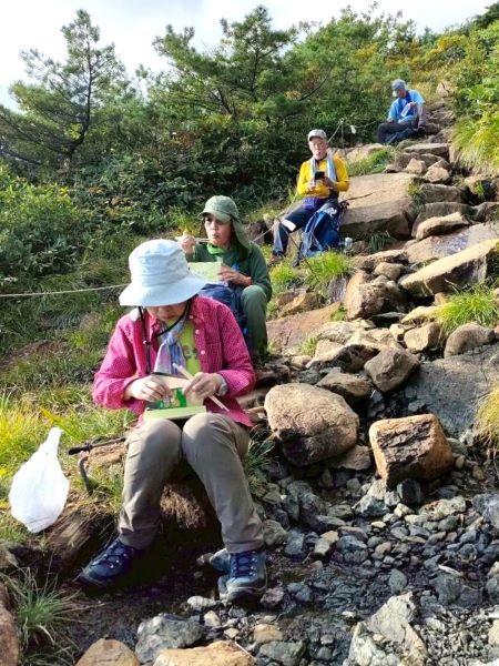 25.朝食(山荘の弁当)休憩 | 26.森林限界を越え周りの景色が良く見える |