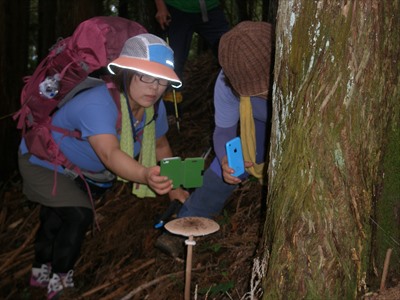 | 13・14.登山道の脇に 背の高いきのこが2本 美しく立っていた 上面の模様も形も美しく「咲いていた」という気配あり。 メンバの中にきのこ好きの女性3人おり スマホでしっかり撮る |