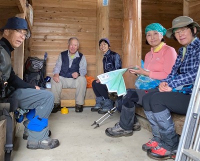 | 19.鳥海山(七高山:シチコウサン2229m)に到着 休憩後「新山」に向かったが、雨まじりの強風のため 引き返す |