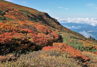 | 43. 錦を纏う男女岳 下の白い線は阿弥陀池に続く木道 |