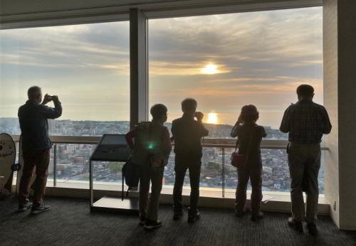 | 03.04.31階展望室から見る信濃川河口のフェリーターミナルと日本海に沈む夕日 | |