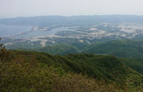| 53.下山途中からの眺め 左から両津港(湾)、加茂湖 | 54.管理道路沿いの残雪 |